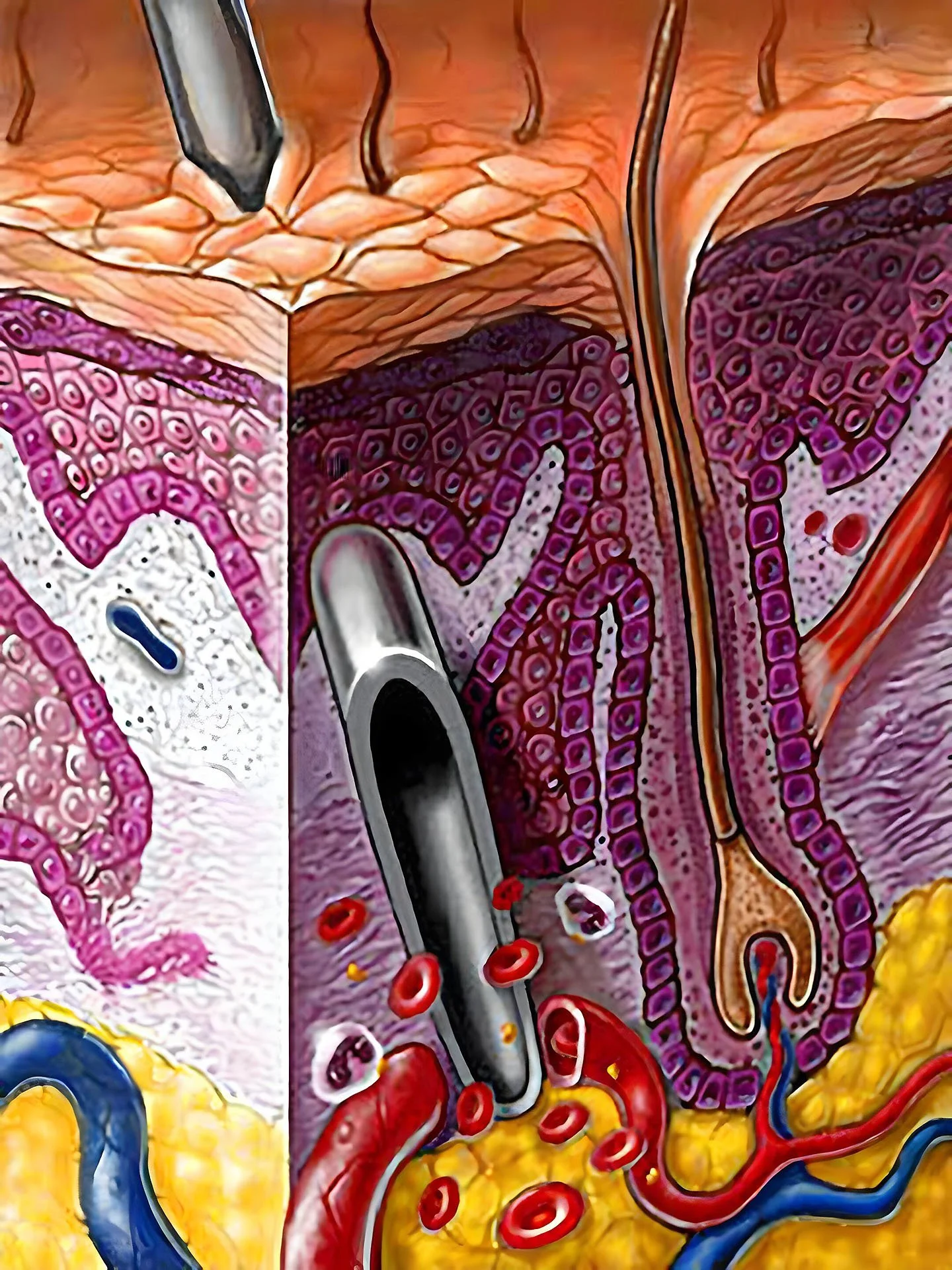 A detailed cross-sectional illustration of human skin, showing hair follicles, blood vessels, and layers of tissue.